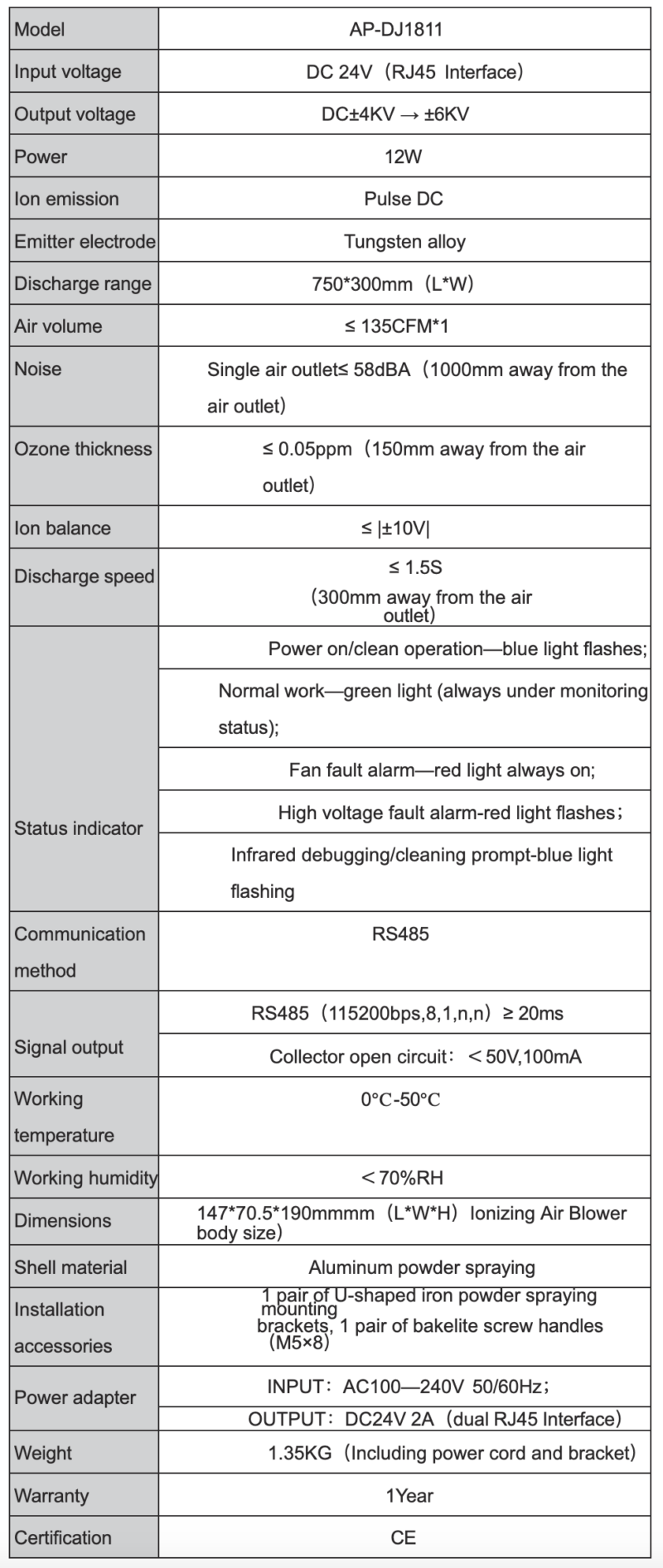 AP-DJ1811 ionizing blower adopts pulse DC static elimination technology with 8 electrode needle design.High air volume,5-speed adjustment,stable performance,Air output volume 1.45 times more than that of the tradional ionizer,LCD display screen available.Negative high voltage amplitude can be adjusted by the remote control for the adjustment of ion balance voltage.